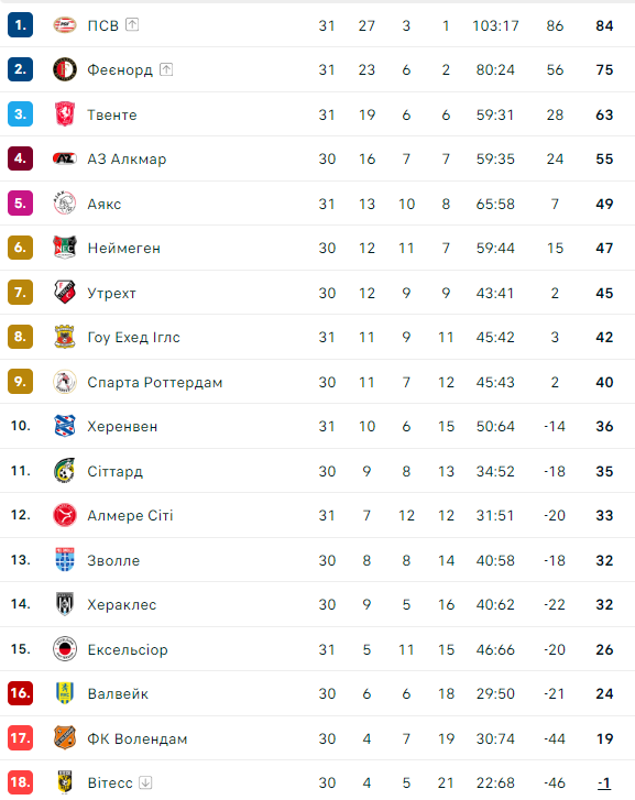 У ПСВ теперь 84 очка. Чтобы стать чемпионами, им достаточно набрать 1 балл за следующие три матча. Клуб из Роттердама уже гарантировал себе минимум второе место.