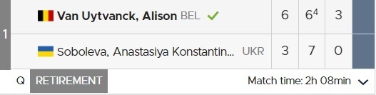 Алисон ван Эйтванк (Бельгия) – Анастасия Соболева (Украина) – 6:3, 6:7(4), 3:0 (отказ)