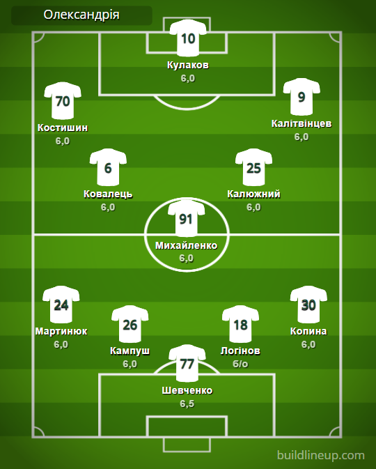 «Александрия»: Шевченко – Мартынюк, Кампуш, Логинов (Билошевский, 9, Кравченко, 78), Копина – Ковалец (Смирный, 62), Михайленко, Калюжный – Костышин (Джевани, 62), Кулаков (Погорелый, 61), Калитвинцев.