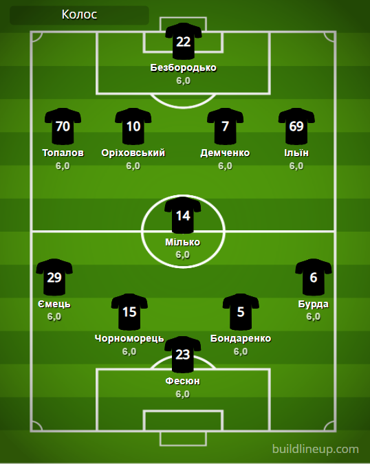 «Колос»: Фесюн – Емец, Черноморец, Бондаренко, Бурда – Милько – Топалов (Велетень, 74), Ориховский (Паулаускас, 88), Демченко, Ильин (Цуриков, 88) – Безбородько (Рангел, 46).