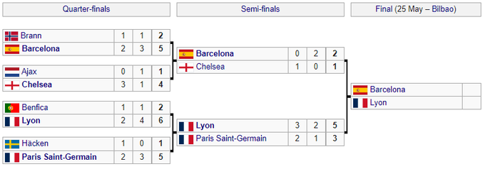 Финал между Барселоной и Лионом запланирован на 25 мая в испанском Бильбао.