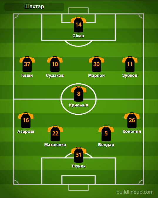 «Шахтер»: Ризнык – Азаров, Матвиенко, Бондарь, Конопля – Крыськив (Назарина, 81) – Кевин (Эгиналду, 64), Судаков, Марлон (Степаненко, 63), Зубков (Швед, 64) – Сикан (Траоре, 64).