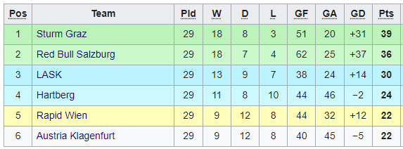 Турнирная таблица чемпионата Австрии (топ-шестерка)