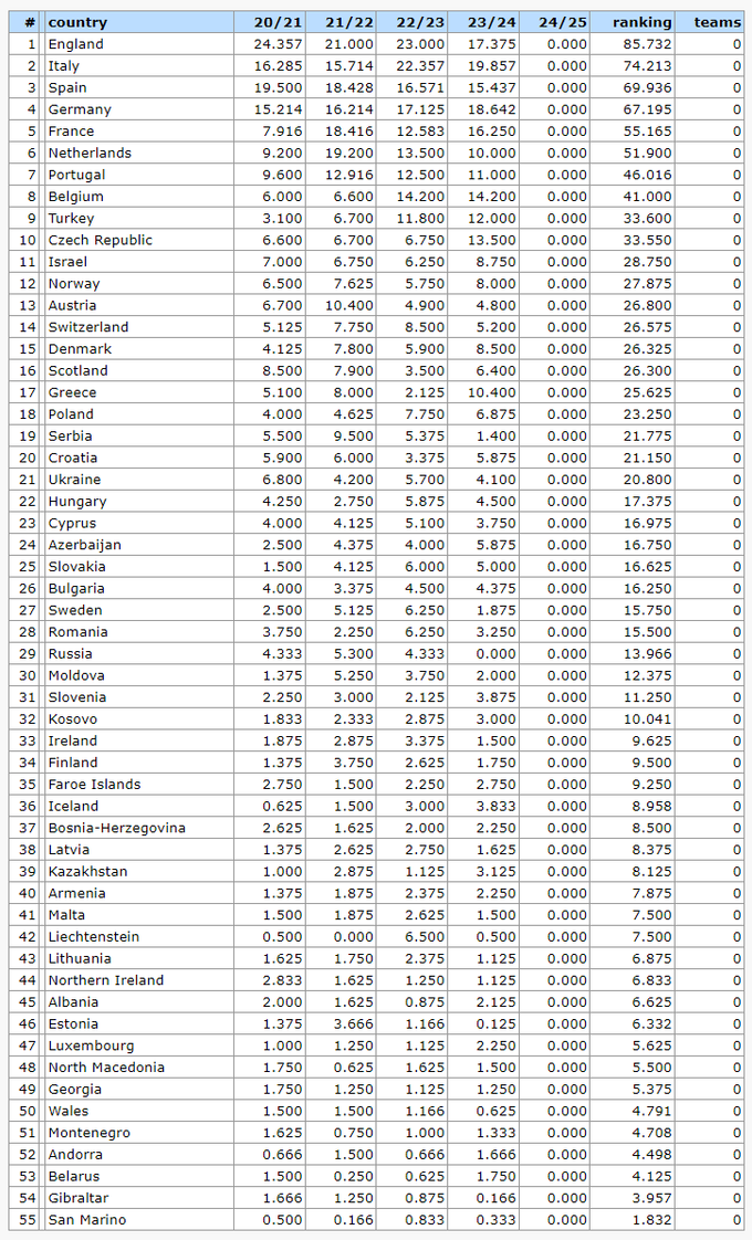 В борьбе грандов уверенно лидирует Англия (104.303), а вот Италия (89.141) опередила Испанию (88.864) в борьбе за втором место. Испания потеряла место в топ-2 рейтинга впервые с 1998 года.