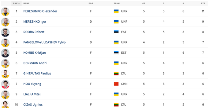У форварда в пяти матчах 5 шайб и 6 результативных передач. Топ-3 на ЧМ замкнули украинский защитник Игорь Мережко, у которого 4 шайбы и 5 ассистов, и форвард Эстонии Роберт Рооба (5 шайб и 3 результативные передачи).