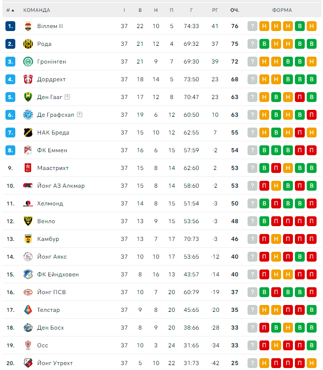 Лидеры второго дивизиона: Виллем II (76 очков) – вышел в элиту, Рода (75), Гронингем (72).