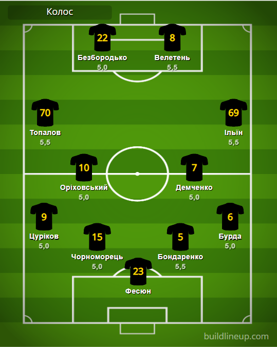 «Колос»: Фесюн – Цуриков (Емец, 84), Черноморец, Бондаренко, Бурда – Топалов (Салабай, 60), Ориховский (Милько, 60), Демченко, Ильин – Безбородько (Рангел, 60), Велетень (Гусол, 84).