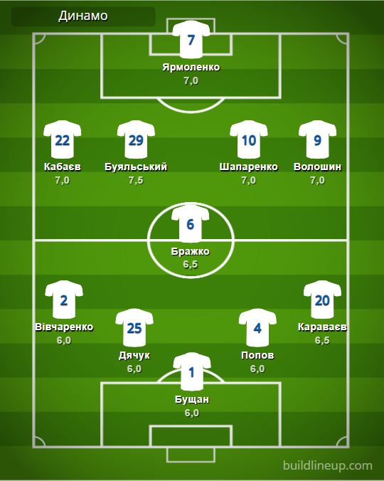 «Динамо» Киев: Бущан – Вивчаренко, Дячук, Попов, Караваев – Бражко (Бенито, 85) – Кабаев (Пономаренко, 73), Буяльский (Андриевский, 73), Шапаренко (Шепелев, 72), Волошин (Диалло, 78) – Ярмоленко.