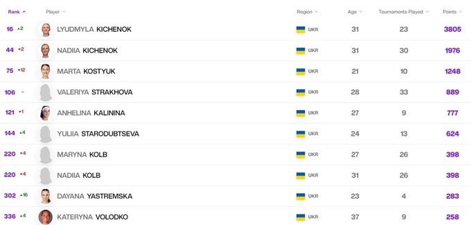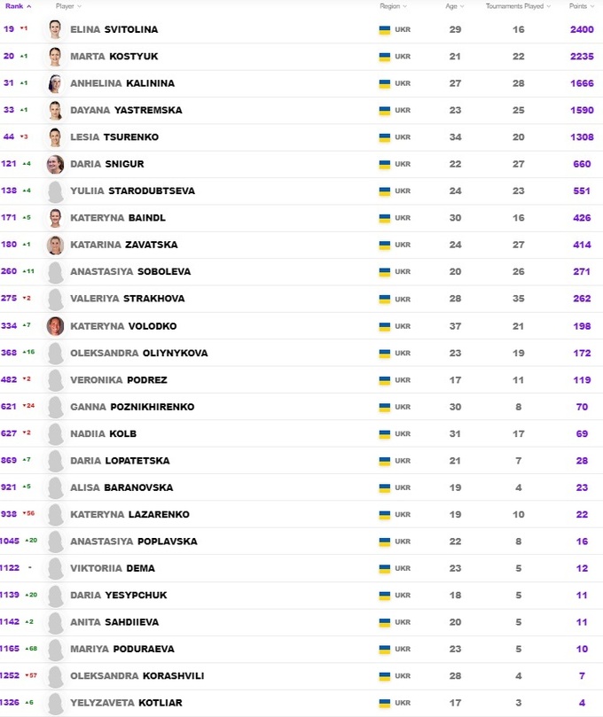 Украинки в рейтинге WTA