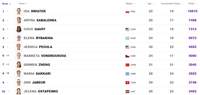 Чемпионкой стала первая ракета Ига Свёнтек, которая увеличила отрыв от второго места.