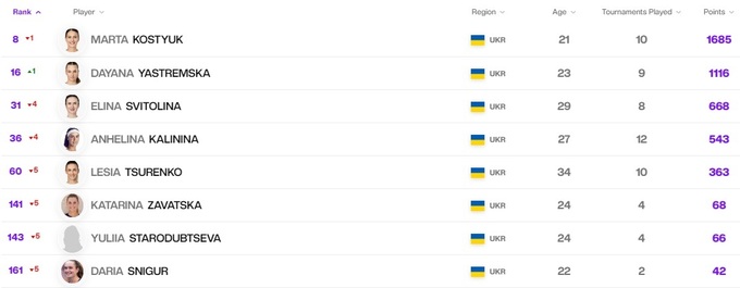 Украинские теннисистки установили национальный рекорд: впервые две представительницы Украины оказались в топ-20 мирового рейтинга. Элина Свитолина опустилась с 18 на 19 строчку, а Марта Костюк дебютировала в двадцатке лучших.