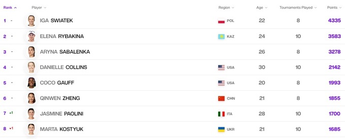 В Чемпионской гонке Жасмин Паолини обошла Костюк, но Марта остается в восьмерке лучших теннисисток сезона. Свёнтек лидирует с солидным преимуществом.