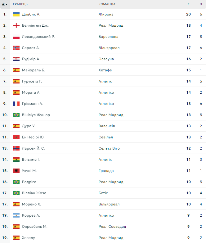 Украинский форвард Артем Довбик продолжает лидировать в списке бомбардиров. Он отличился забитым голом в поединке против «Барселоны» (4:2), а также отдал ассист. На счету украинца 20 голов и 6 голевых передач.