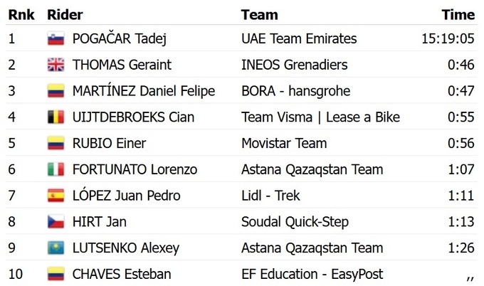 Розовую майку лидера общего зачета сохранил на своих плечах словенец Тадей Погачар из «UAE Emirates».