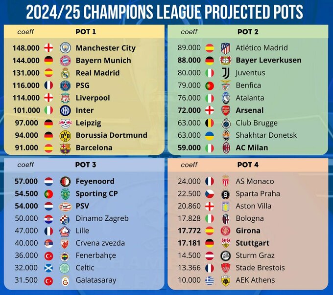 Прогнозный посев в основном раунде Лиги чемпионов 2024/25