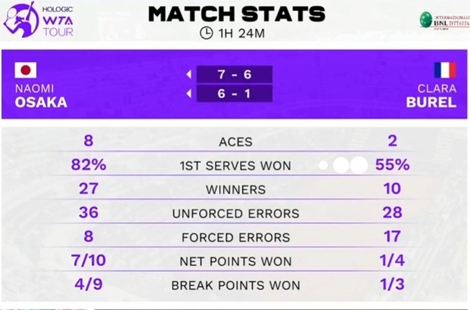 Rolling on in Rome 👌@naomiosaka passes her first test by defeating Burel 7-6(2), 6-1.#IBI24 pic.twitter.com/1cWZutePQP