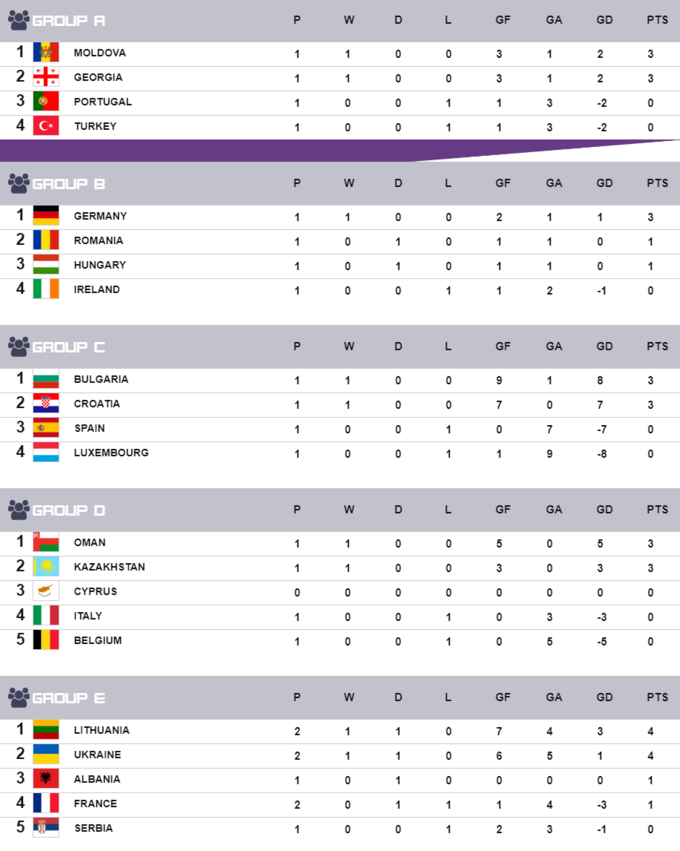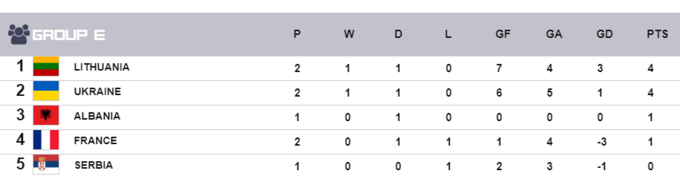 Команды Литвы и Украины лидируют в группе набрав по 4 очка после двух матчей. Албания и Франция имеют по 1 пункту, Сербия пока идет без набранных баллов.
