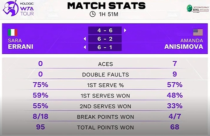 Итальянка Сара Эррани (№93 WTA) обыграла американскую теннисистку Аманду Анисимову (№237 WTA) в первом раунде грунтового турнира WTA 1000 в Риме.