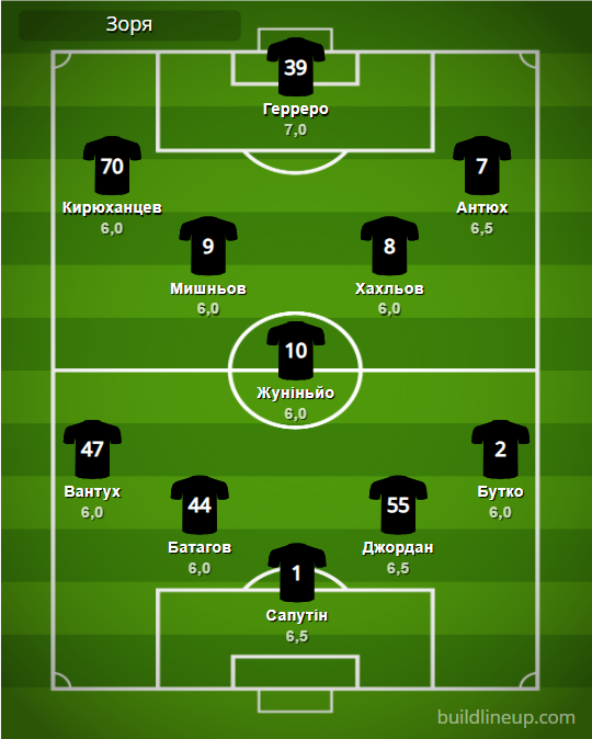 «Заря»: Сапутин – Вантух, Батагов, Джордан, Бутко – Мишнев, Жуниньо (Бугай, 63, Горбач, 90+3), Хахлев (Мичин, 82) – Кирюханцев, Герреро (Ндур, 90+3), Антюх.