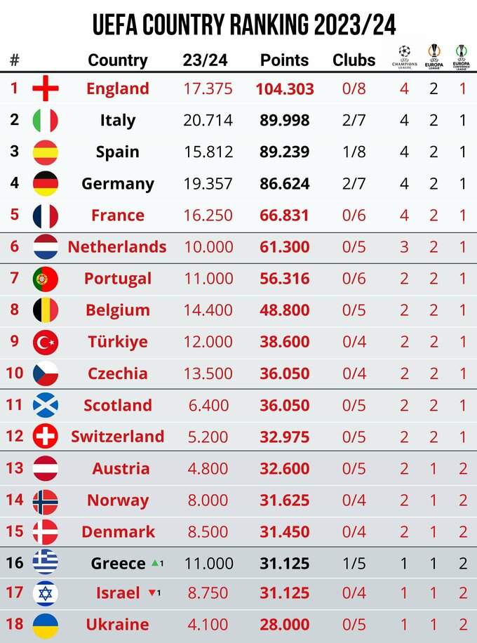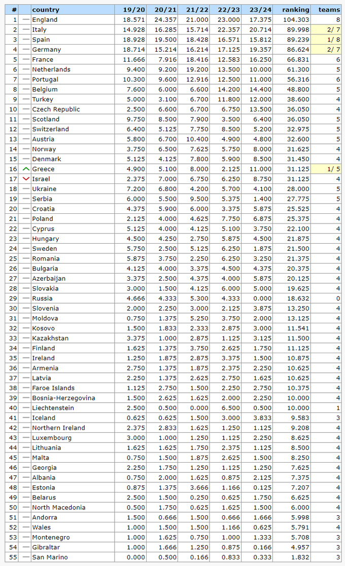 Греция увеличила свой отрыв от Украины, прибавив +0.600 за победу и бонусом (суммарно 31.125). В Лиге конференций Олимпиакос вышел в финал, дважды обыграв Астон Виллу (4:2 на выезде, 2:0 дома). В итоге Греция даже опередила Израиль (по доп. показателю) и вышла на 16-е место. Если Олимпиакос выиграет финал в основное или дополнительное время (но не по пенальти), то Греция опередит Данию в борьбе за 15-е место, что позволить выставить через один сезон две команды в Лигу чемпионов.