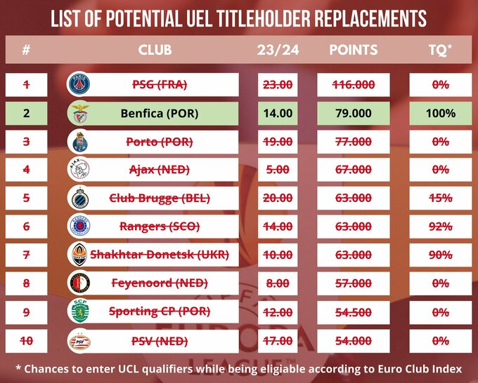 Интересно, что Бенфика с украинским голкипером Анатолием Трубиным, финишировав второй в чемпионате Португалии, может напрямую попасть в основу Лиги чемпионов (а не в Q3, как до перераспределения путевок). Это произойдет, если немецкий Байер выиграет финал Лиги Европы у итальянской Аталанты (или же если команда из Бергамо войдет в топ-4 в Серии A, что под вопросом). В таком случае место обладателя трофея ЛЕ останется вакантным, и благодаря высокому рейтингу среди команд по Пути нечемпионов (представителей лиг) Бенфика займет вакантное место в основном раунде ЛЧ.