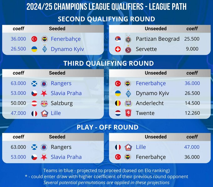 Якщо Бенфіка потрапить в ЛЧ напряму, то в 2 раунді квалу будуть тільки дві пари (як і в минулому році): представники Туреччини, Швейцарії, України та Чехії (з 12 по 15 місце в рейтингу 2023). Посів відбудеться згідно особистого коефу, і станом на зараз сіяними будуть Фенербахче і Славія, а несіяними - Динамо та Серветт/Лугано. Якщо Бенфіка напряму не потрапить, то буде три пари, але станом на зараз другим в Австрії йде РБ Зальцбург, він попаде до сіяних, а Партизан до несіяних. Тож це не так оптимістично для киян...