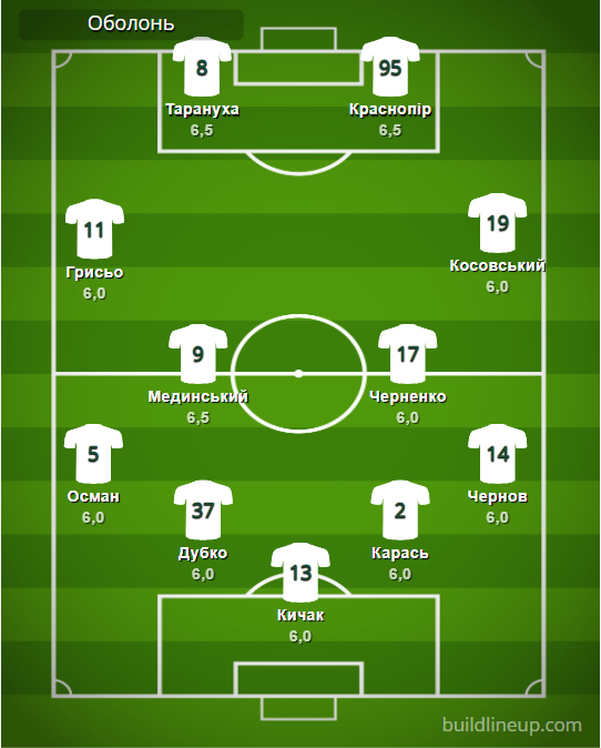 «Оболонь»: Кичак – Осман, Дубко, Карась, Косовский – Грисьо (Нагиев, 84), Мединский, Черненко, Чернов (Суханов, 65) – Тарануха (Вишневский, 71), Краснопир.