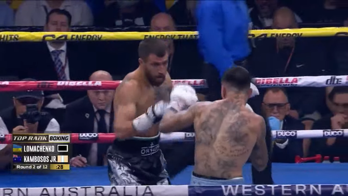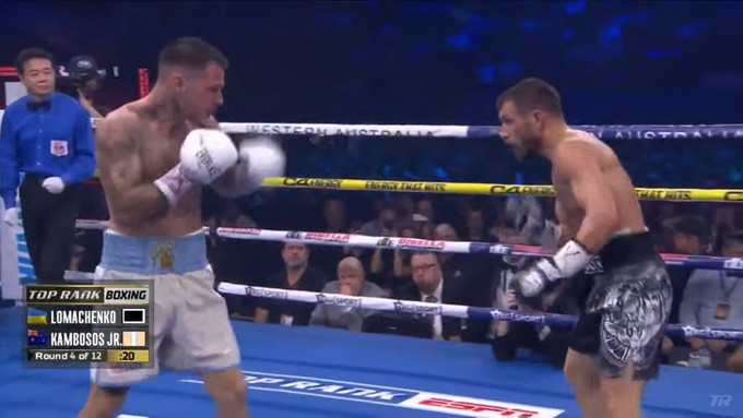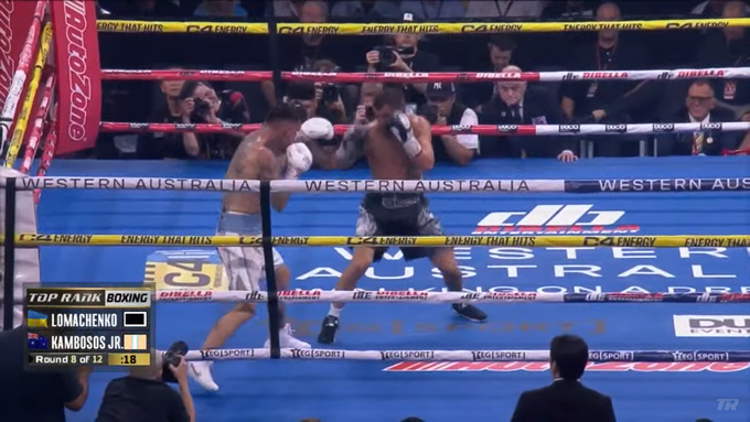 Ломаченко, казалось, игрался с соперником. Хорошо двигался, превосходил соперника в тайминге и выигрывал раунд за раундом. Хотя австралиец был на грани поражения, Камбососу его тренеры советовали давить и идти на соперника.
