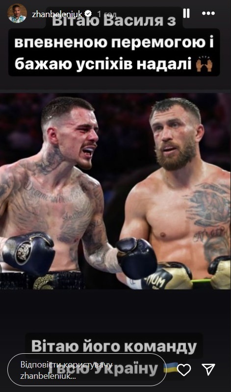 «Поздравляю Василия с уверенной победой и желаю успехов в дальнейшем. Поздравляю его команду и всю Украину», – написал Беленюк в сториз инстаграма.