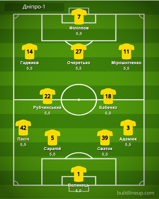 «Днепр-1»: Волынец – Пасич (Третьяков, 61), Сарапий, Сваток, Адамюк – Рубчинский (Когут, 80), Бабенко – Гаджиев (Пихаленок, 57), Очеретько, Мирошниченко (Леднев, 46) – Филиппов (Кивинда, 57).