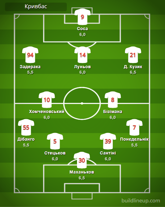 «Кривбасс»: Маханьков – Дибанго (По, 60), Бескоровайный, Сантини, Понедельник (Стецьков, 81) – Хомченовский, Бизимана (Бандейра, 81) – Задерака (Близниченко, 71), Лунев, Д. Кузык – Соса.