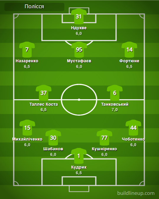 «Полесье»: Кудрик – Михайличенко, Шабанов, Кушниренко, Чоботенко – Таллес Коста, Танковский (Крамар, 90+3) – Назаренко, Мустафаев, Фортюне – Ндукве (Луифер, 74).