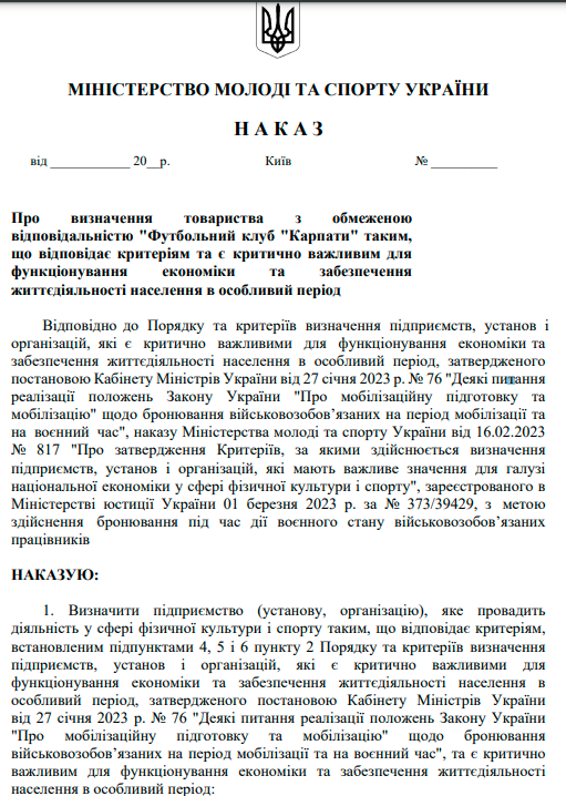 Как сообщило Министерство молодежи и спорта Украины, львовский футбольный клуб «Карпаты» признан организацией, критически важной для функционирования экономики Украины и обеспечения жизнедеятельности.