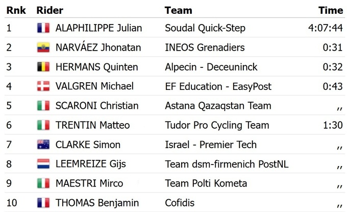 В топ-3 на этапе также попали эквадорец Джонатан Нарваэс из «Ineos Grenadiers» и бельгиец Кентен Херманс из «Alpecin Deceuninck». Розовую майку лидера общего зачета сохранил словенец Тадей Погачар из «UAE Emirates».