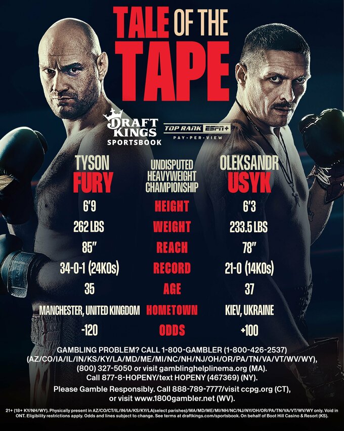 В 12-раундовом поединке встретятся украинский боксер Александр Усик (21–0, 14 КО) и британец Тайсон Фьюри (34–0–1, 24 КО).