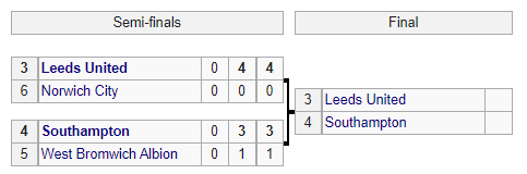 Решающий матч, в котором будет разыграна 3-я путевка в АПЛ, между Лидсом и Саутгемптоном пройдет 26 мая в Лондоне на Уэмбли.
