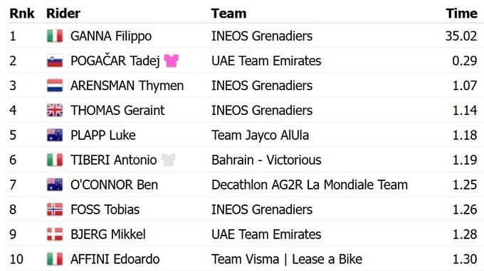 Партнер Ганны по «Ineos Grenadiers», британец Герэйнт Томас, показал сегодня четвертый результат, что позволило ему обойти Дани Мартинеса и выйти на второе место в генеральной классификации Джиро-2024.