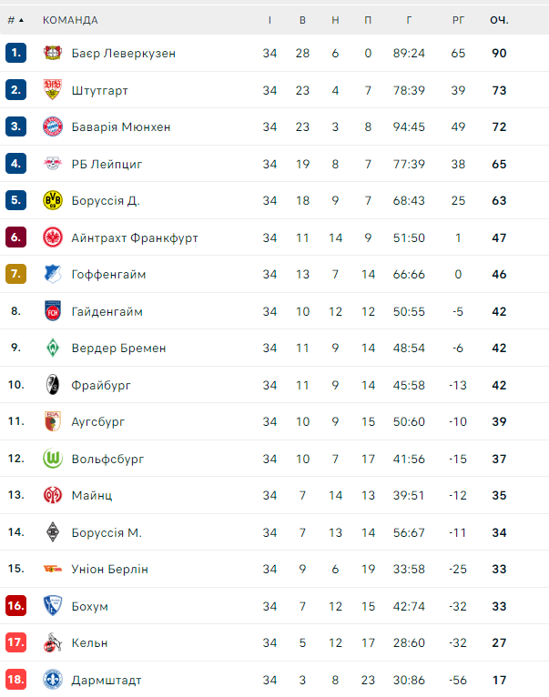 Также в ЛЧ пробились «РБ Лейпциг» и «Боруссия Д». В Лигу Европы квалифицировался «Айнтрахт». «Хоффенхайму» досталась путевка в Лигу конференций.