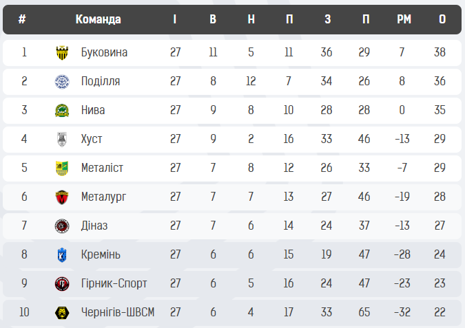 Кремень (24), Горняк-Спорт (23) и Чернигов (22) вылетели во Вторую лигу.