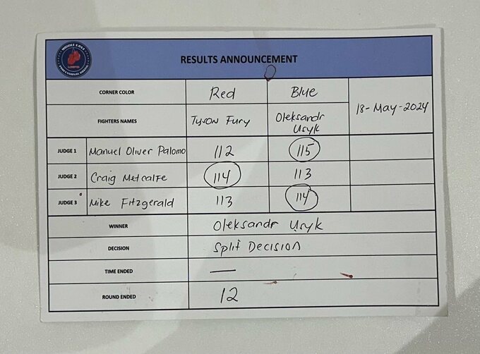 Майкл Баффер показал карточку, с которой он оглашал результат боя Усика