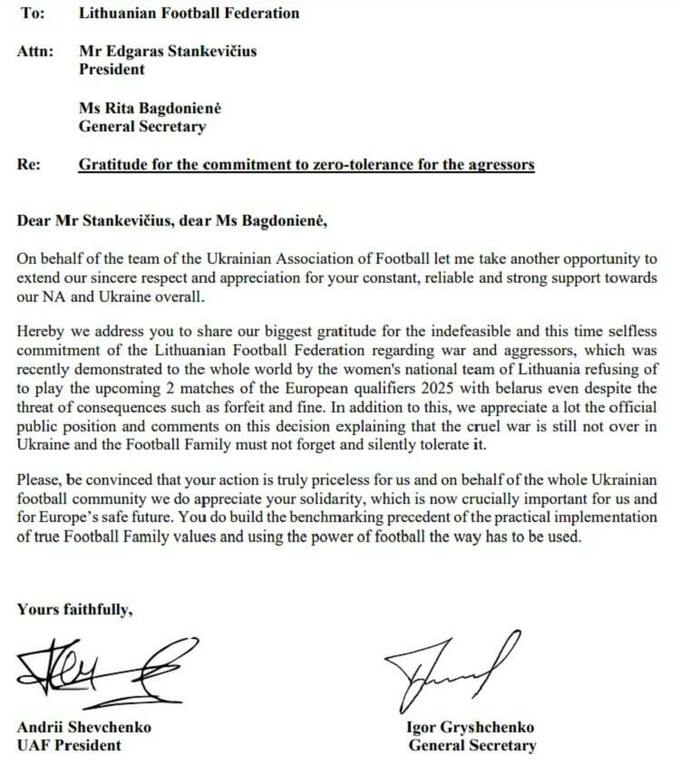 Украинская ассоциация футбола (УАФ) направила официальное письмо с благодарностью руководителям LFF с подписями президента Андрея Шевченко и генерального секретаря Игоря Грищенко: