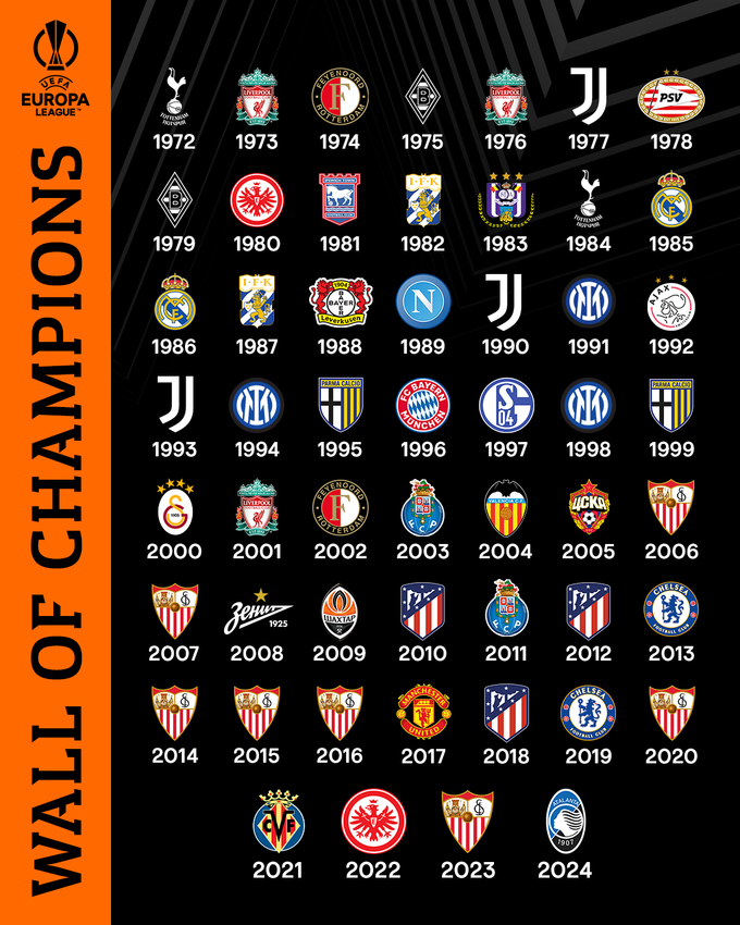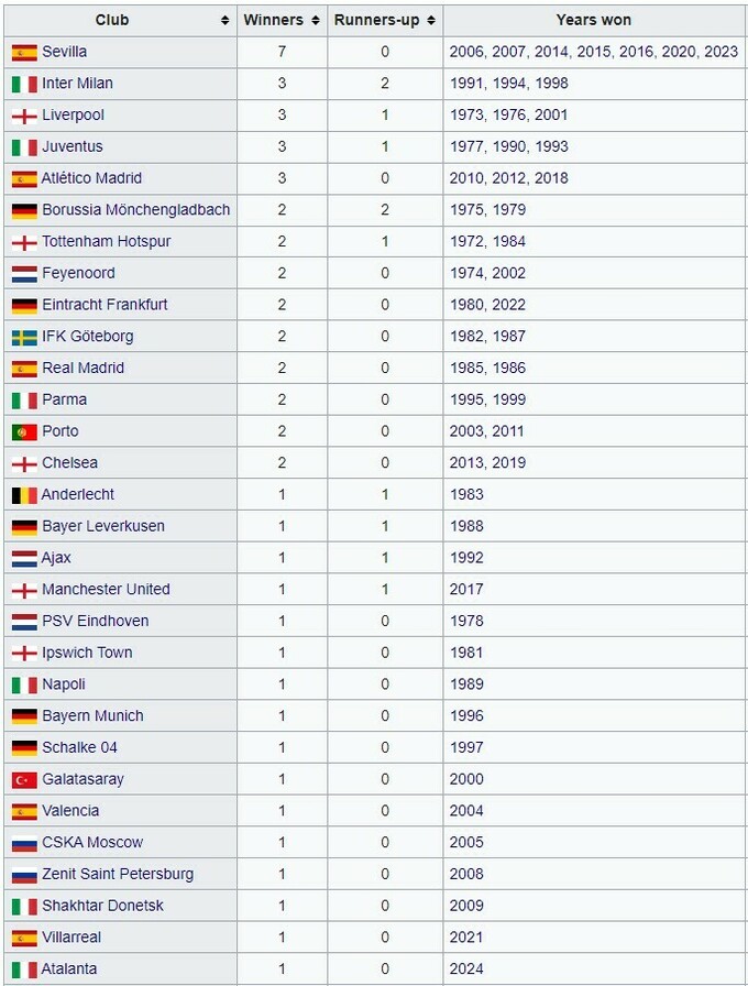 Больше всего титулов Лиги Европы имеет Севилья (7), дальше идут Интер, Ливерпуль, Ювентус, Атлетико Мадрид (по 3).
