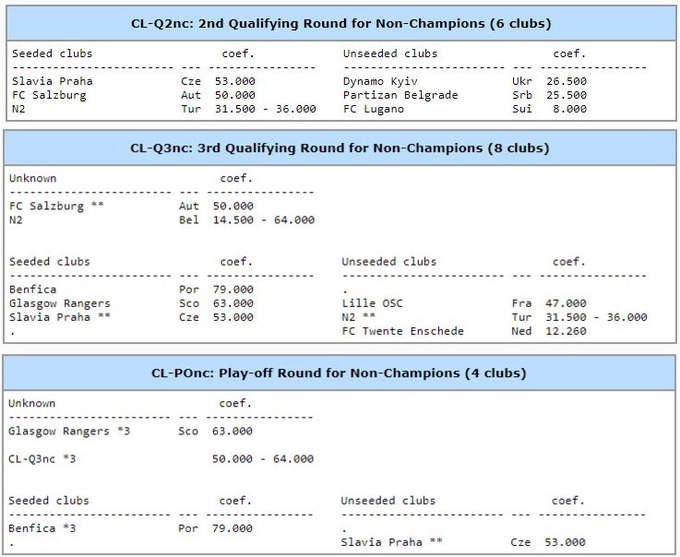 Если «Динамо» окажется вне посева Q2, то соперниками столичного клуба могут стать «Славия» Прага (Чехия), «РБ Зальцбург» (Австрия) либо вице-чемпион Турции [Гаталасарай или Фенербахче].