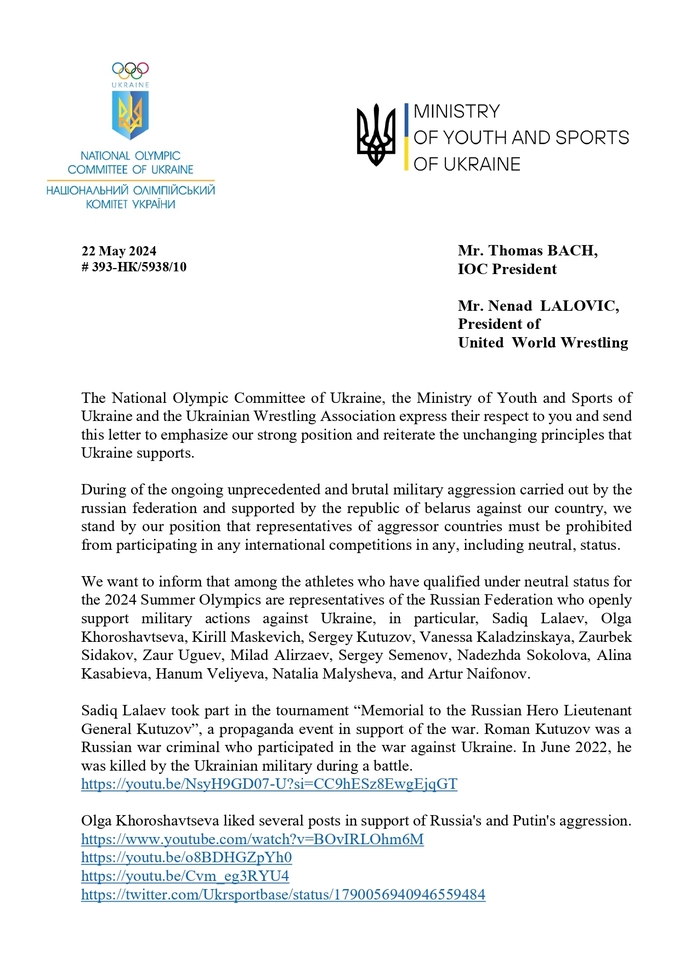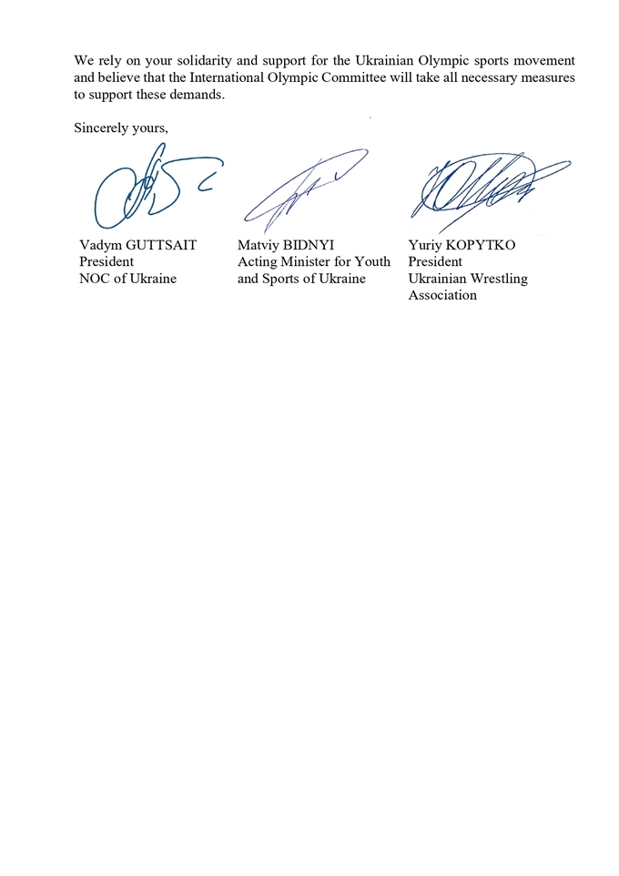 Президент Национального олимпийского комитета Украины Вадим Гутцайт, и.о. Министра молодежи и спорта Украины Матвей Бидный и президент Ассоциации спортивной борьбы Украины Юрий Копытко направили совместное письмо Международному олимпийскому комитету в связи с квалификацией на Париж-2024 представителей рф и рб, которые открыто поддерживают военные действия против Украины.