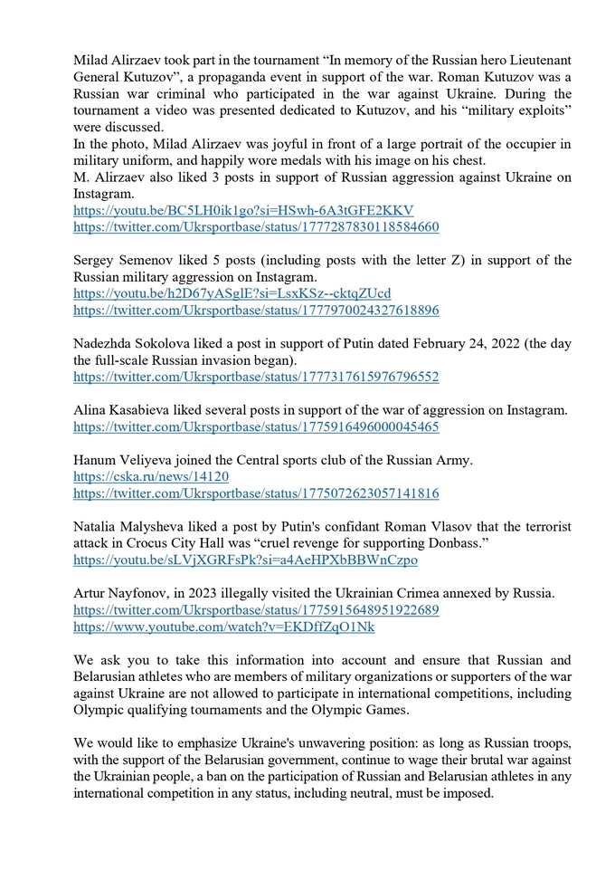 В письме приведены факты поддержки войны этими атлетами. Подписанты просят принять во внимание информацию и обеспечить предотвращение участия российских и белорусских спортсменов, являющихся членами военных организаций или сторонниками войны против Украины, в международных соревнованиях, в частности квалификационных турнирах к Олимпийским играм и другим квалификационным турнирам.