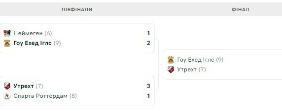 В полуфиналах Гоу Эхед Иглз обыграл НЕК Неймеген (2:1), а Утрехт справился со Спартой из Роттердама (3:1).