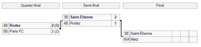 В полуфинале плей-офф Сент-Этьен обыграл Родез (2:0) и за путевку в Лигу 1 сразится с клубом Мец, стыковые поединки пройдут 30 мая и 2 июля.