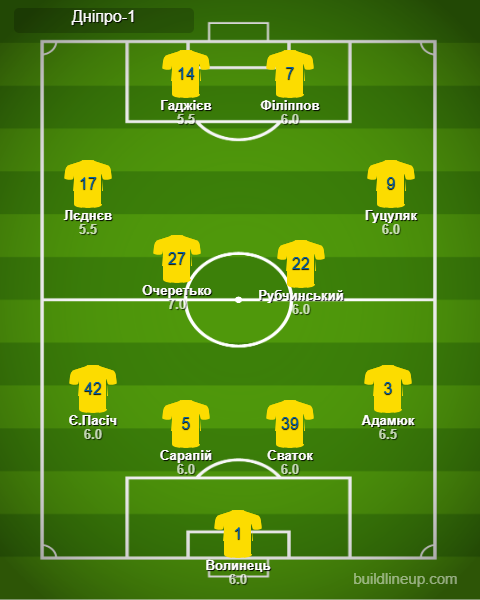 «Днепр-1»: Волынец – Адамюк, Сарапий, Сваток, Е.Пасич – Очеретько, Рубчинский, Леднев, Гуцуляк (Когут, 74), Гаджиев (Танчик, 69) – Филиппов (Третьяков, 58).