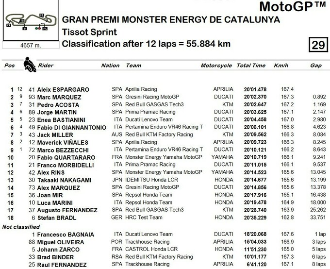 Лидер команды Априлия Алейш Эспаргаро выиграл спринт Гран-при Каталонии на трассе в Барселоне. В своей домашней гонке Эспаргаро стартовал с поула, однако неудачно – откатился на пятое место, а на третьем круге проиграл еще одну позицию. Но к восьмому кругу лидер Априлии был вторым, а на последнем круге сошел лидер, действующий чемпион мира Франческо Баньяйя. Этот сход позволил Эспаргаро выиграть домашний спринт.