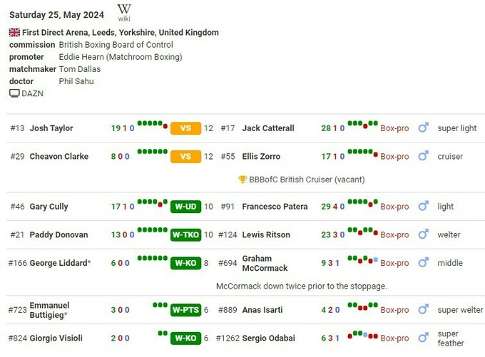 - Пэдди Донован (13–0, 10 KO) – Льюис Ритсон (23–3, 13 KO)
